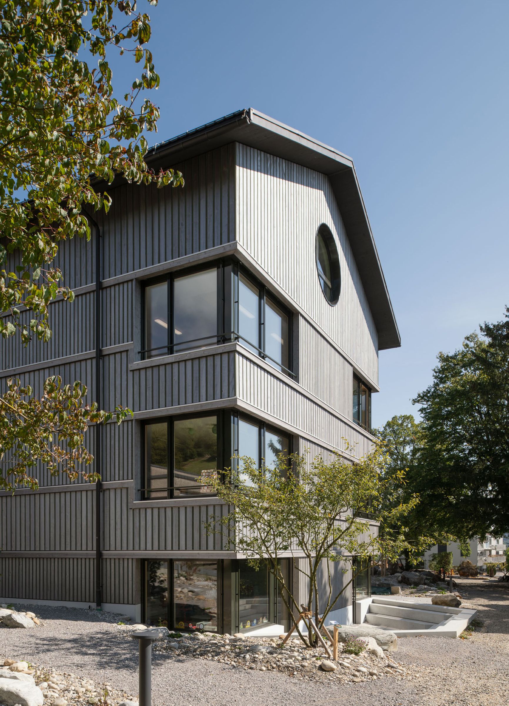 Erstellt wurde die Erweiterung konsequent in Holzbauweise. Sogar der Liftschacht. Im Altbau beschränkte man sich auf minimale Eingriffe zur Unterbringung von Gruppenräumen und Einhaltung von Normen, u.a. wurde das bestehende Treppenhausgeländer erhöht. Das Solardach sorgt schliesslich für eine nachhaltige Energieversorgung.