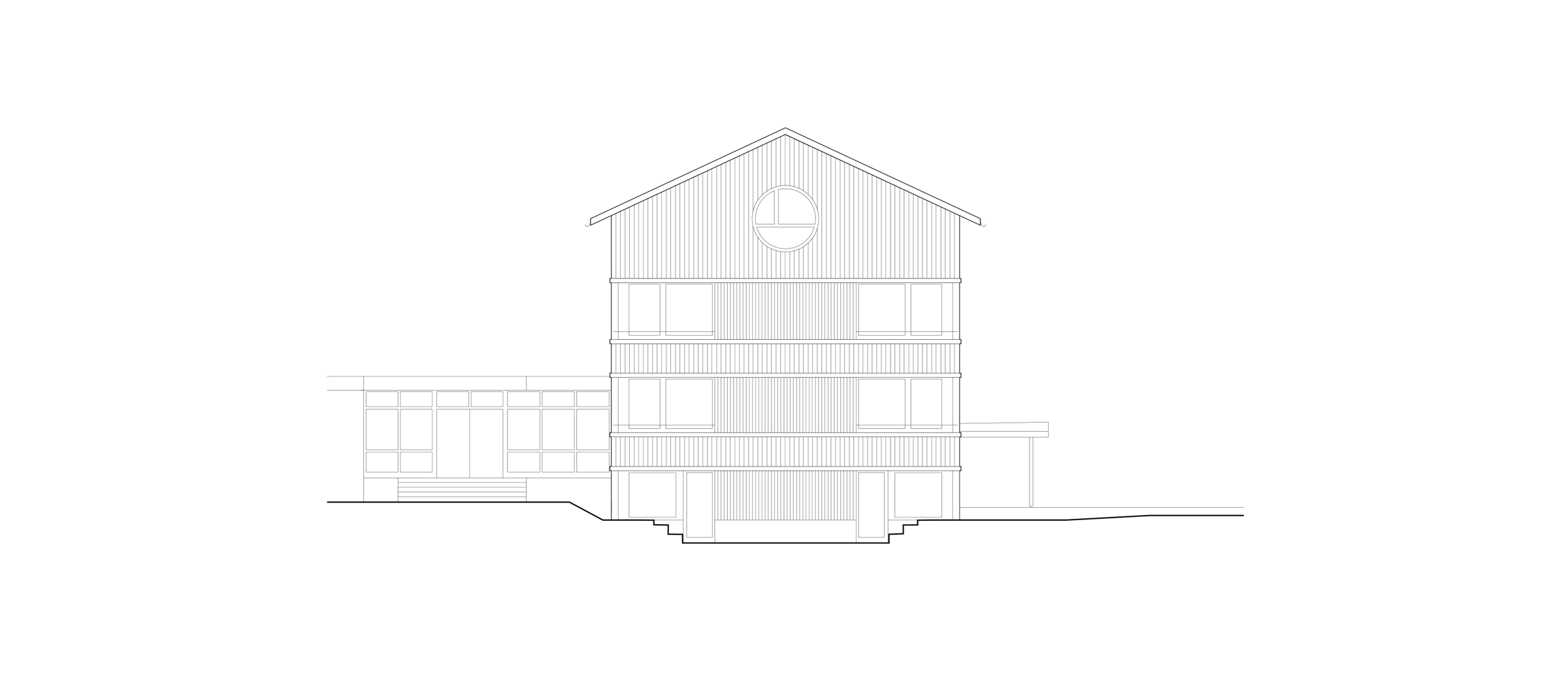 Der neue Kopfbau macht aus der Not eine Tugend: Die Grunddisposition mit der um ein halbes Geschoss versetzten Eingangsebene wird auf die darüberliegenden Gruppenräume übertragen. Diese liegen ein paar Stufen über den Hauptebenen und zeichnen sich so als ruhige Orte des Rückzugs aus. Der Kindergartenbereich im Tiefparterre wiederum profitiert von einer kleinen Aussenarena, welche zwischen dem Innenraum und der Umgebung vermittelt. Neben den drei Unterrichtseinheiten befindet sich im Dachraum ein grosszügiges Lehrpersonenzimmer mit angehängter Mediathek. Der neue, zentral positionierte Lift bedient alle Ebenen und macht die Schule hindernisfrei.
