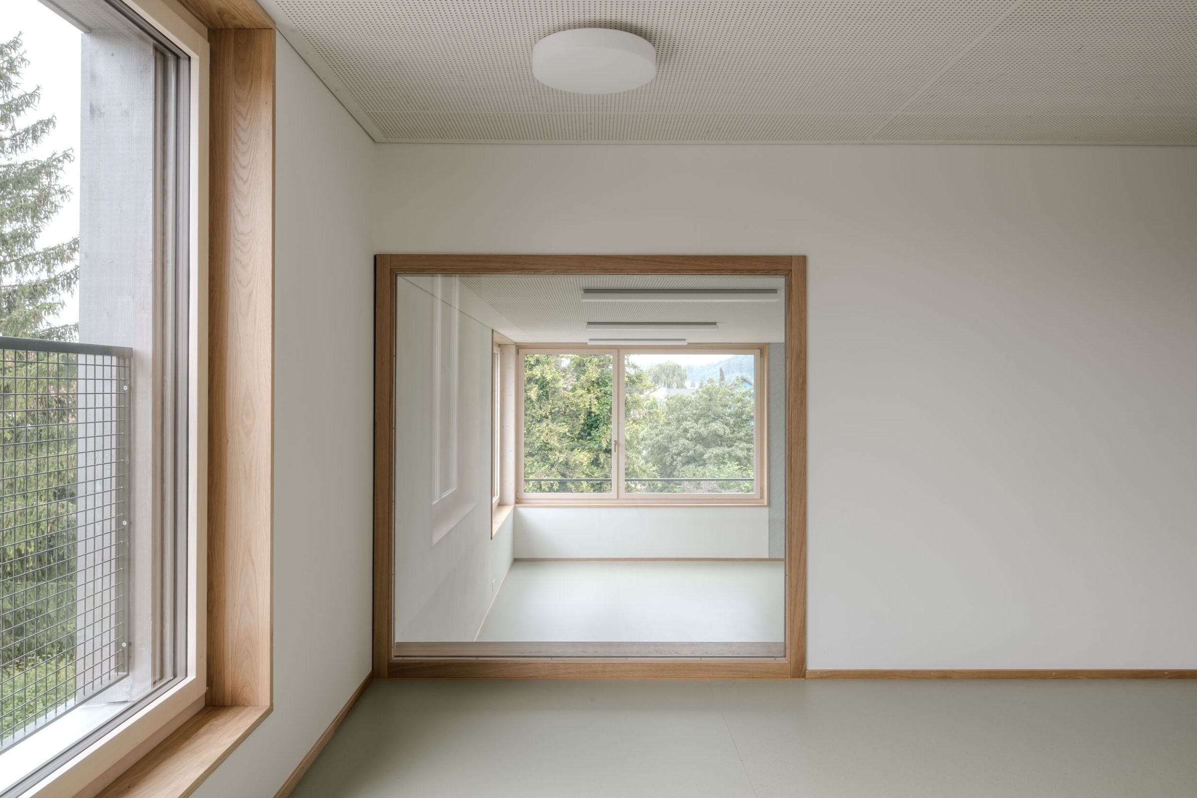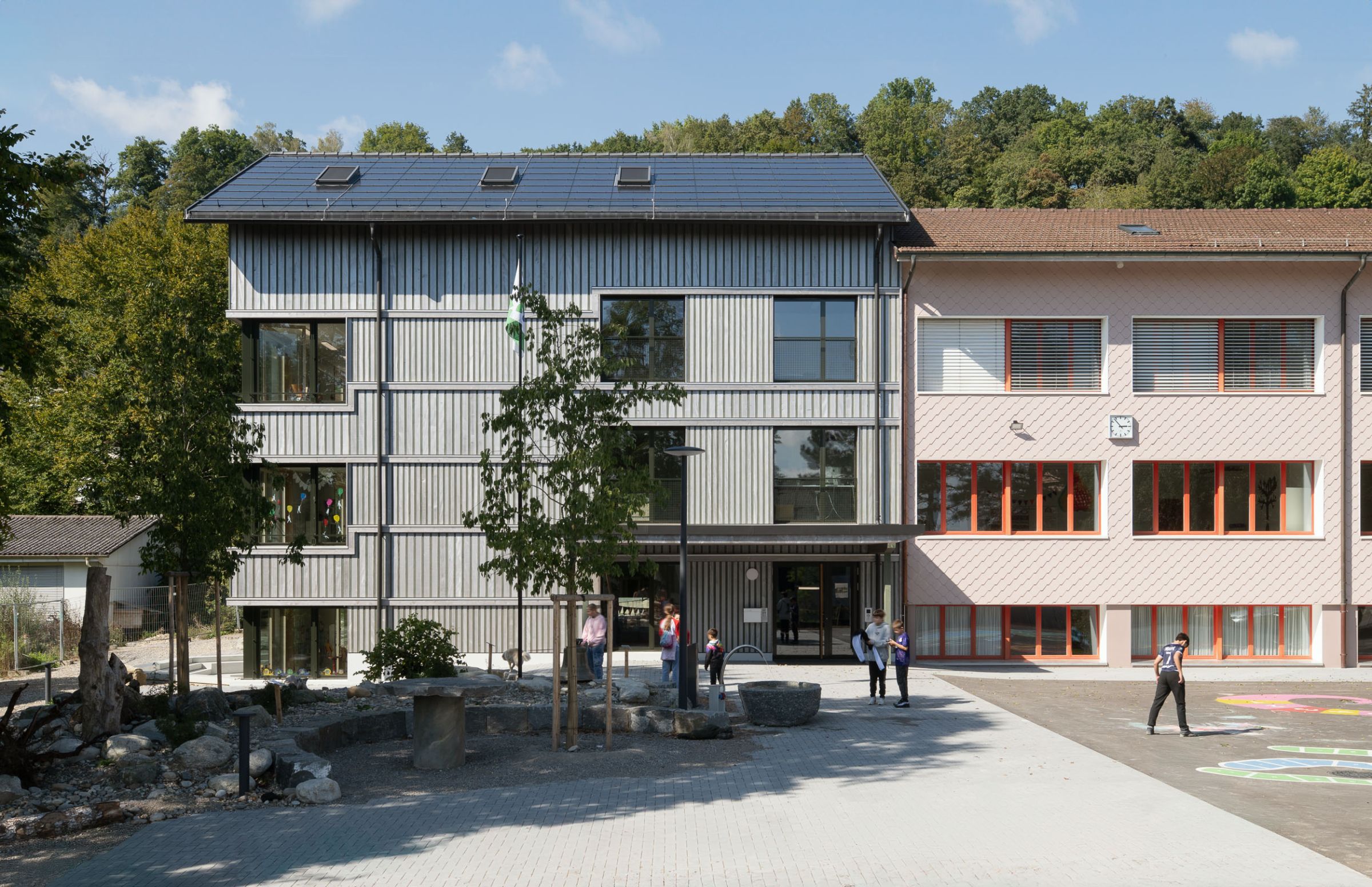 Erstellt wurde die Erweiterung konsequent in Holzbauweise. Sogar der Liftschacht. Im Altbau beschränkte man sich auf minimale Eingriffe zur Unterbringung von Gruppenräumen und Einhaltung von Normen, u.a. wurde das bestehende Treppenhausgeländer erhöht. Das Solardach sorgt schliesslich für eine nachhaltige Energieversorgung.