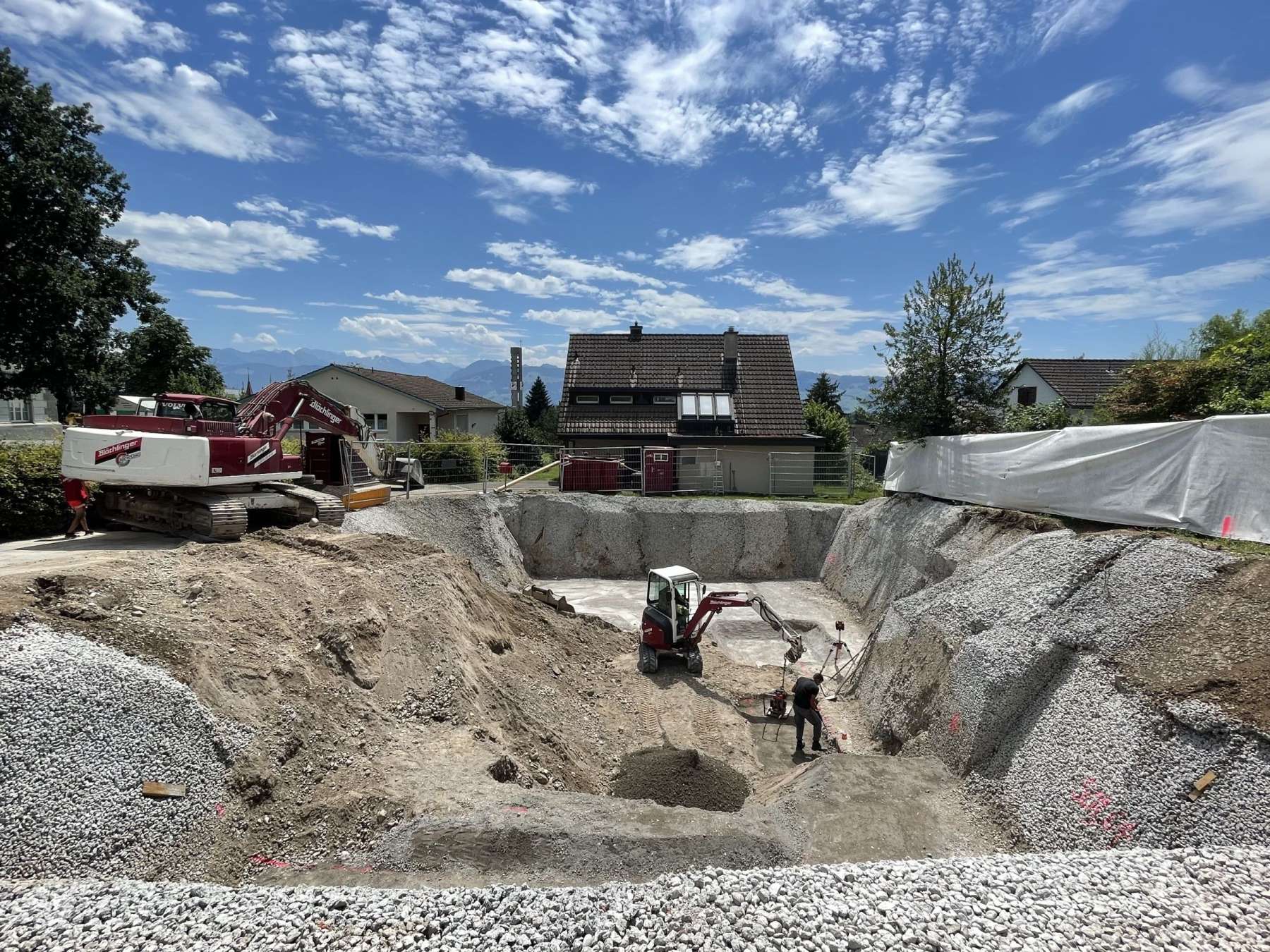 Baugrube für ein privates Mehrgenerationenhaus. Der Aushub ist gemacht. Nach den Sommerferien 2024 beginnen die Bauarbeiten am Fundament und der Kanalisation.