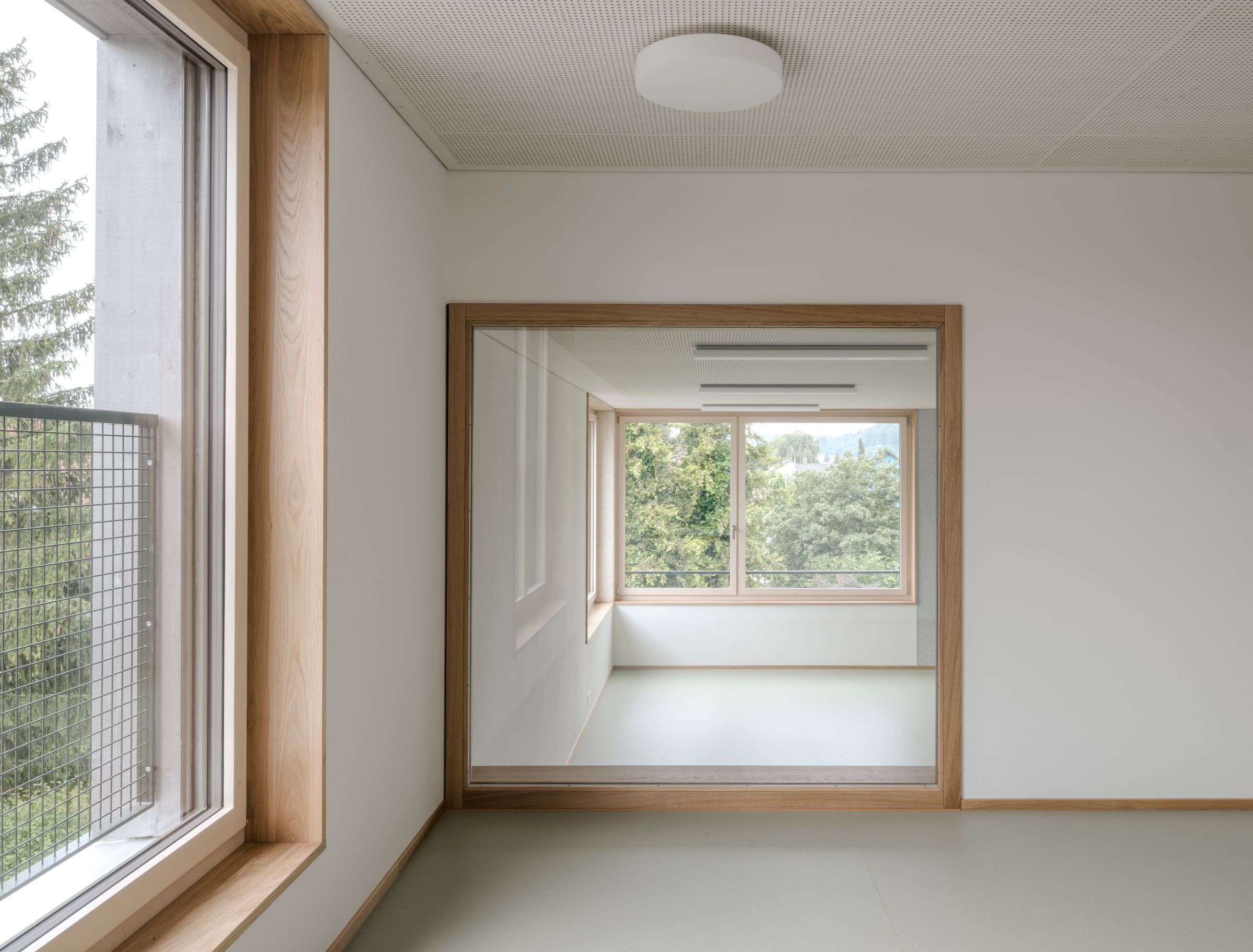 Erstellt wurde die Erweiterung konsequent in Holzbauweise. Sogar der Liftschacht. Im Altbau beschränkte man sich auf minimale Eingriffe zur Unterbringung von Gruppenräumen und Einhaltung von Normen, u.a. wurde das bestehende Treppenhausgeländer erhöht. Das Solardach sorgt schliesslich für eine nachhaltige Energieversorgung.
